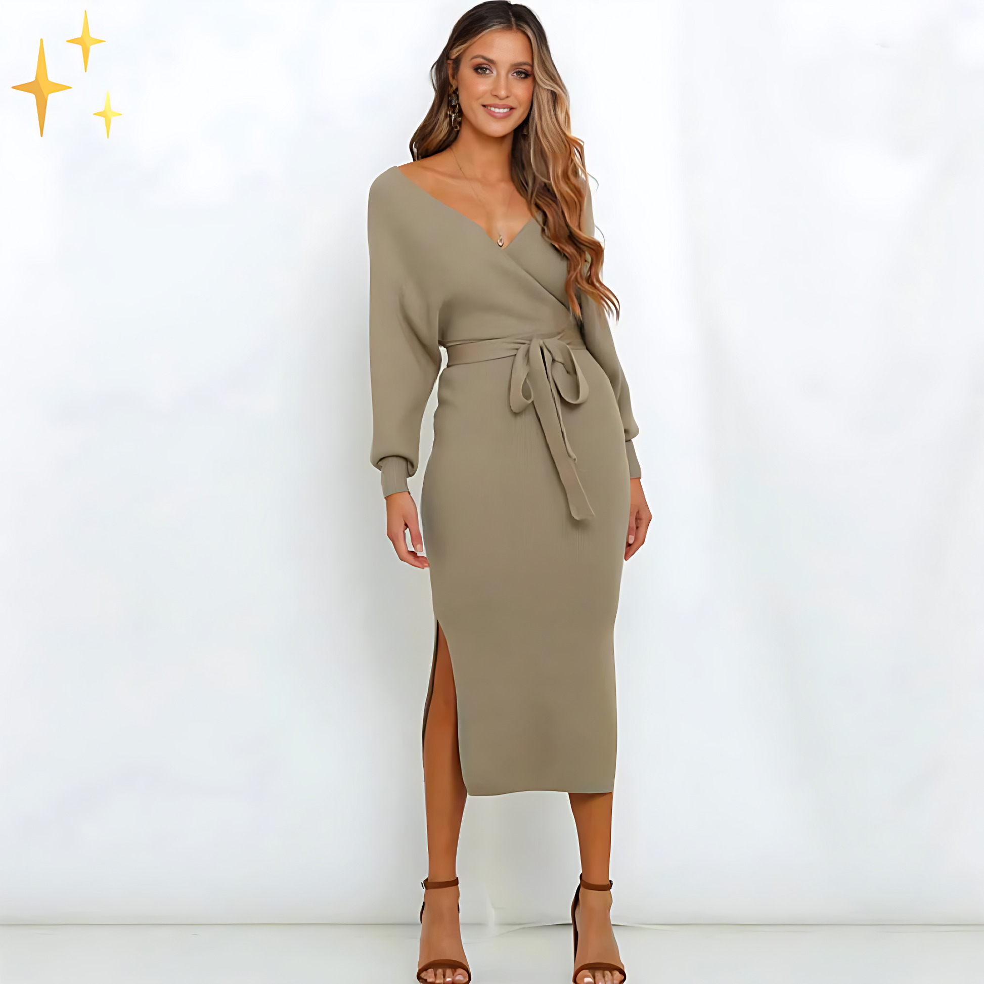 Step into elegance and comfort with this stunning knitted wrap midi dress. Featuring a flattering wrap design and a cozy knit texture, this dress is perfect for both casual outings and special occasions.